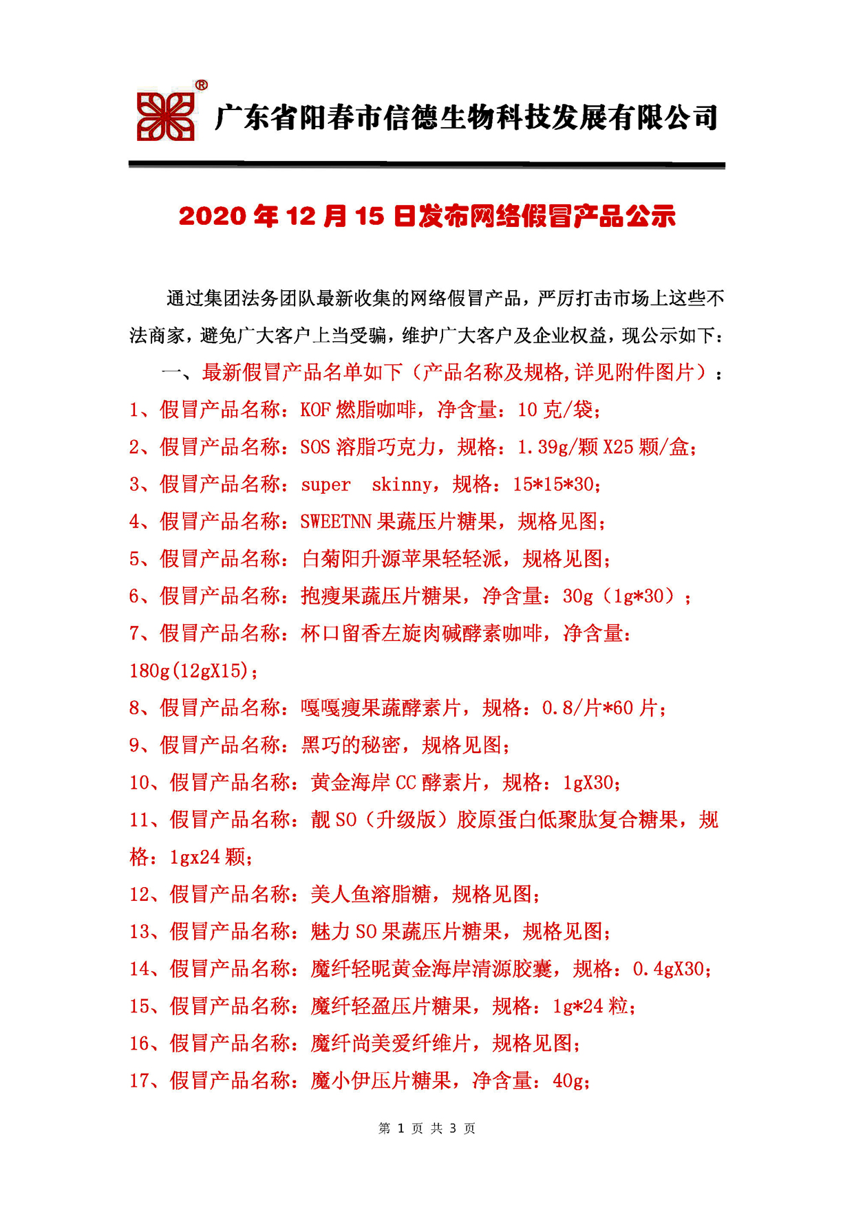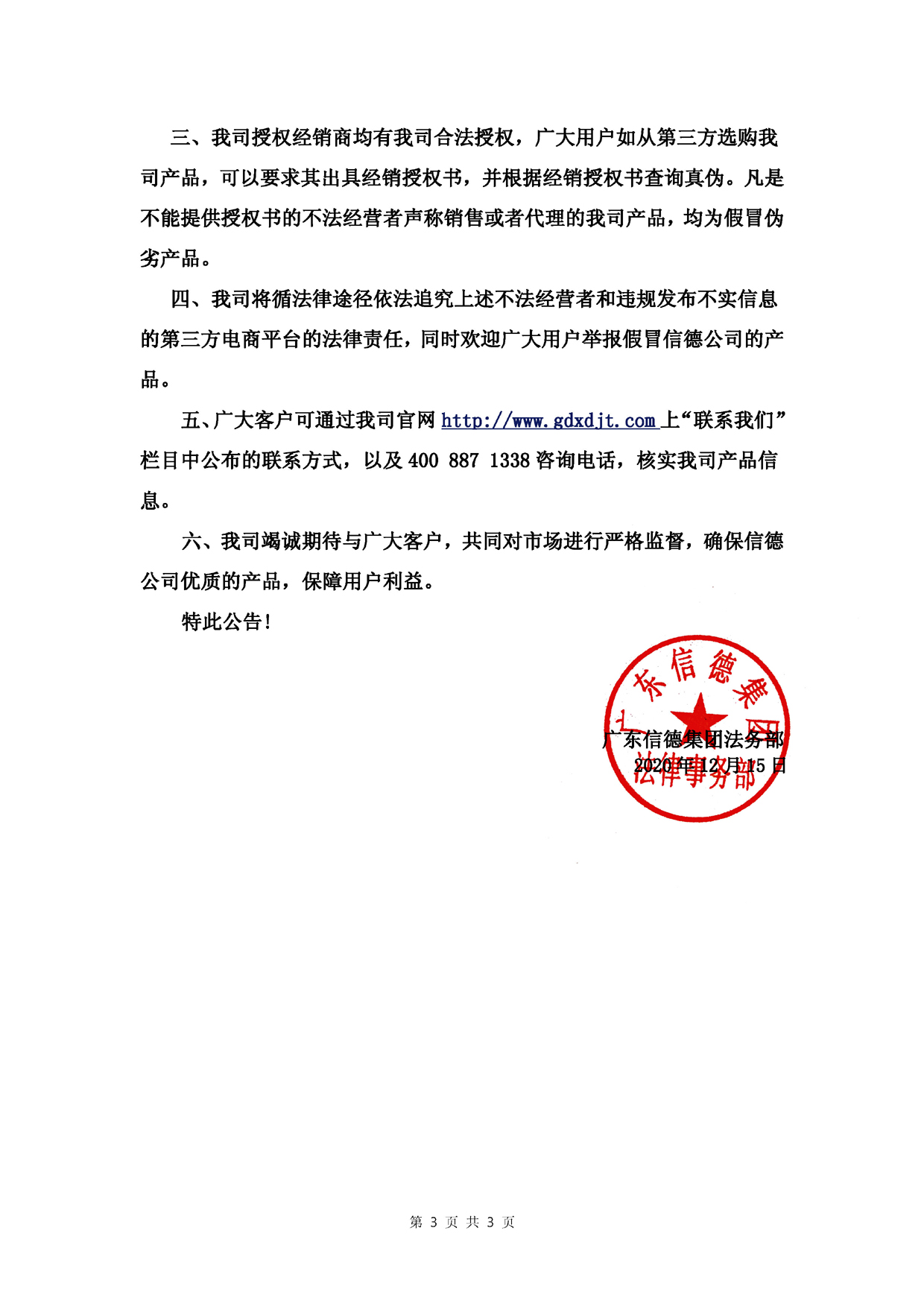 2020年12月15日廣東信德集團發布網絡最新假冒產品公示!!!