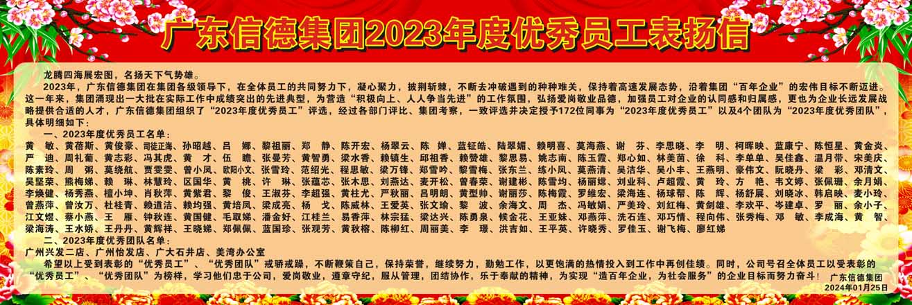 這一年來,集團湧現出一大批在實際工作中成績突出的先進典型,為營造“積極向上、人人爭當先進”的工作氛圍,弘揚愛崗敬業品德,加強員工對企業的認同感和歸屬感,更也為企業長遠發展戰略提供合適的人才,廣東信德集團組織了“2023年度優秀員工”評選,經過各部門評比、集團考察,一致評選並決定授予172位同事為“2023年度優秀員工”以及4個團隊為“2023年度優秀團隊”,具體明細如下: