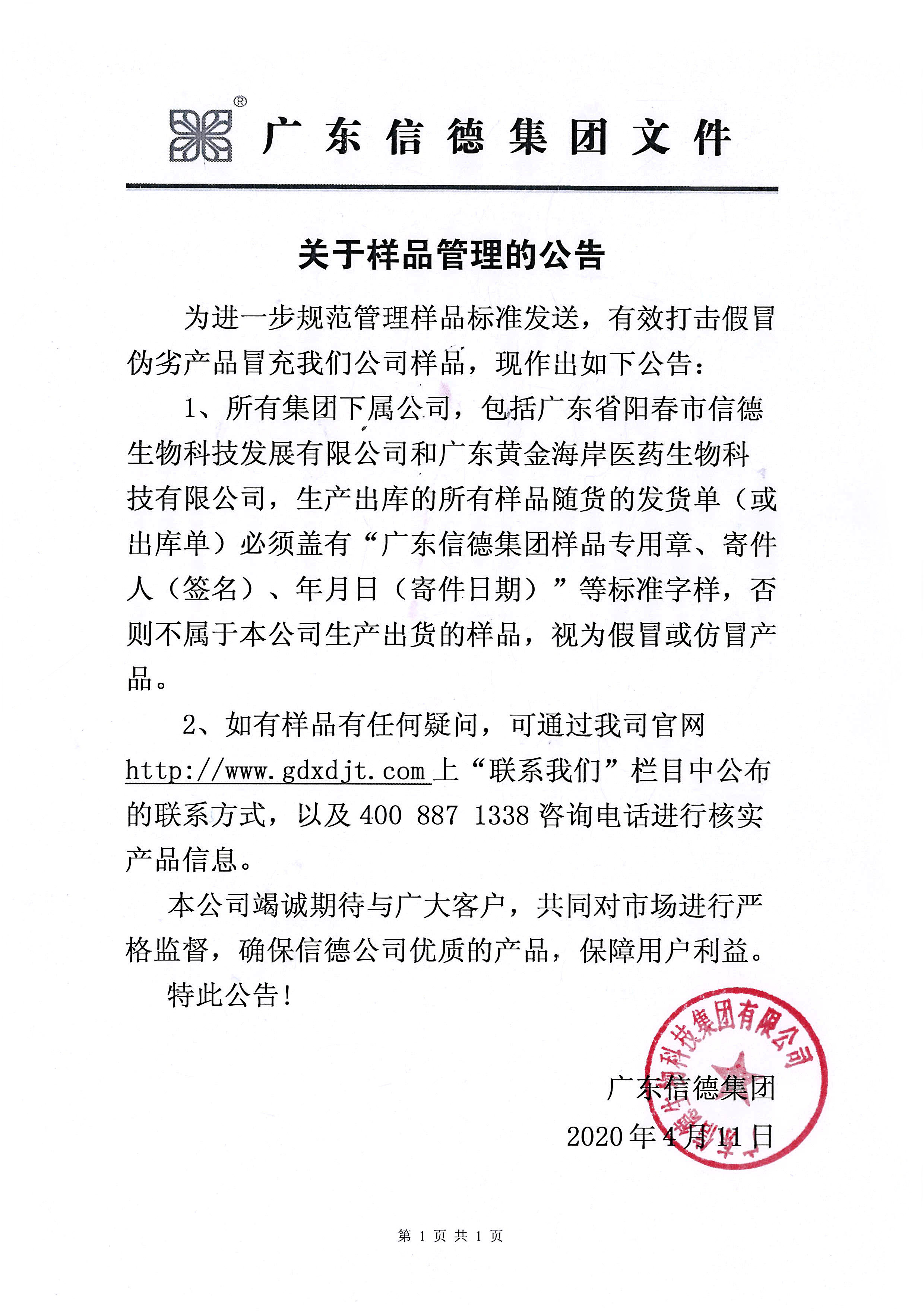1、所suo有you集ji團tuan下xia屬shu公gong司si,包bao括kuo廣guang東dong省sheng陽yang春chun市shi信xin德de生sheng物wu科ke技ji發fa展zhan有you限xian公gong司si和he廣guang東dong黃huang金jin海hai岸an醫yi藥yao生sheng物wu科ke技ji有you限xian公gong司si,生sheng產chan出chu庫ku的de所suo有you樣yang品pin隨sui貨huo的de發fa貨huo單dan(或出庫單)必須蓋有“廣東信德集團樣品專用章、寄件人(簽名)、年月日(寄件日期)”等標準字樣,否則不屬於本公司生產出貨的樣品,視為假冒或仿冒產品。