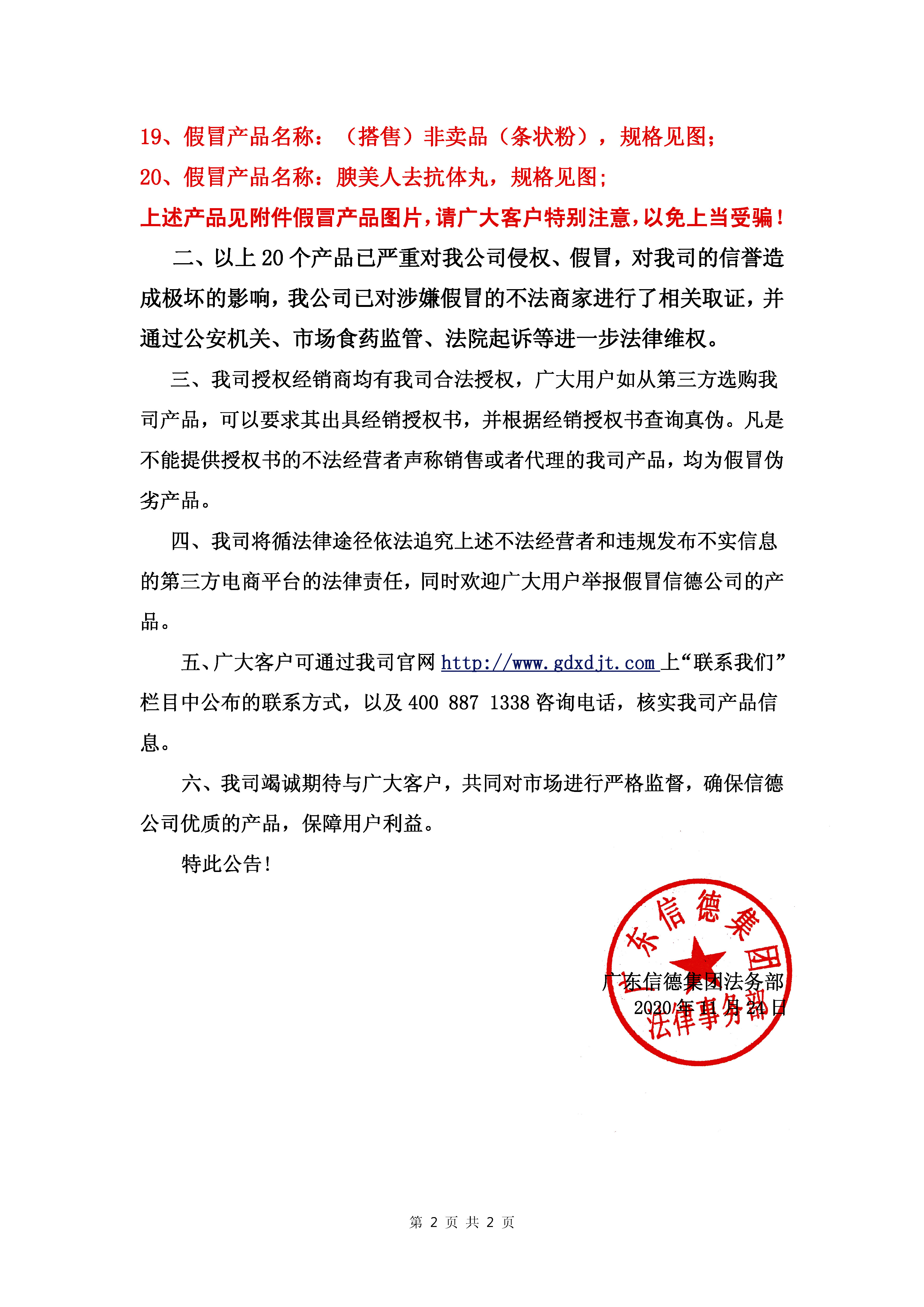 2020年11月24日廣東信德集團發布網絡假冒產品公示!!!