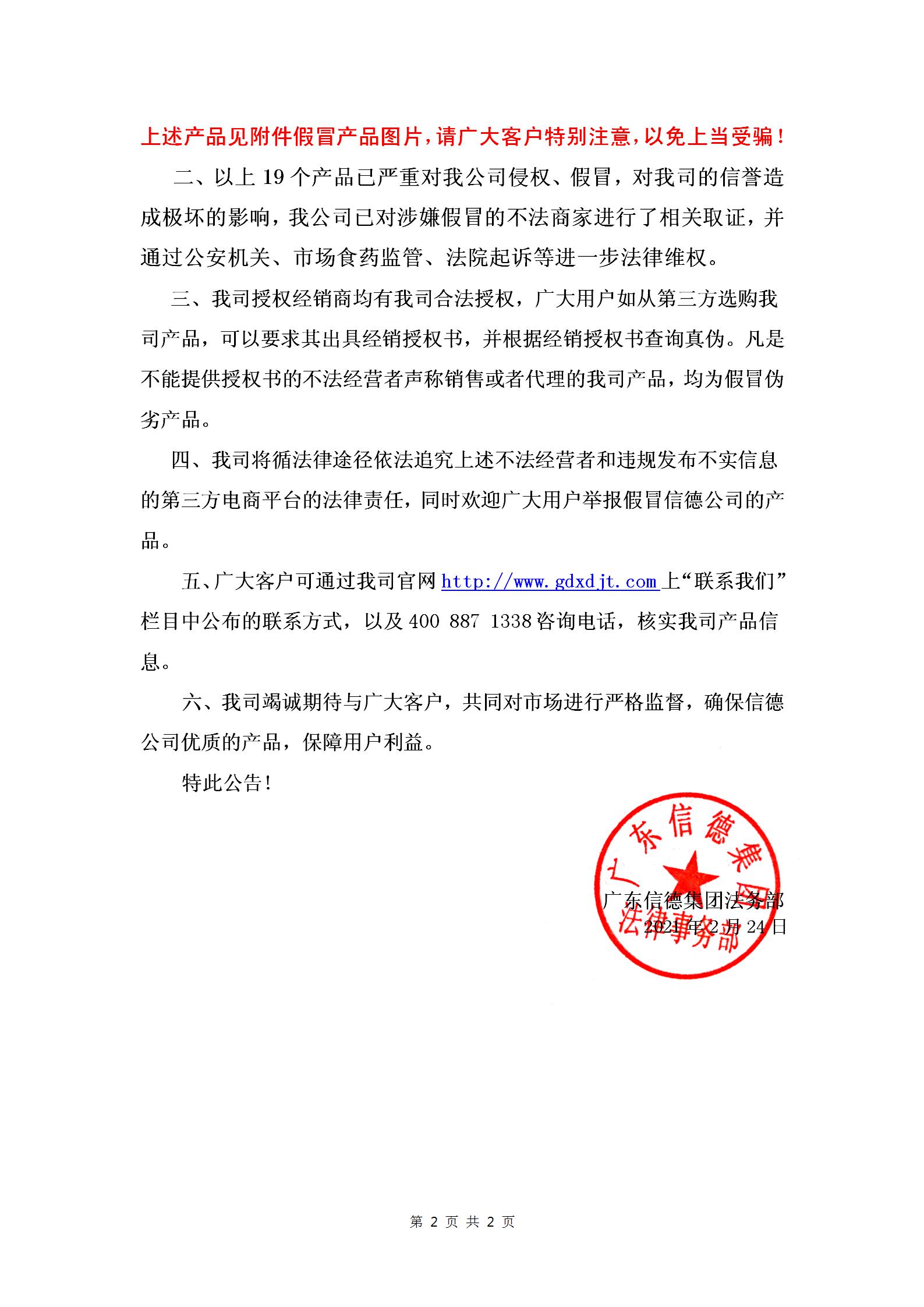 2021年2月24日廣東信德集團發布網絡假冒產品公示!!!