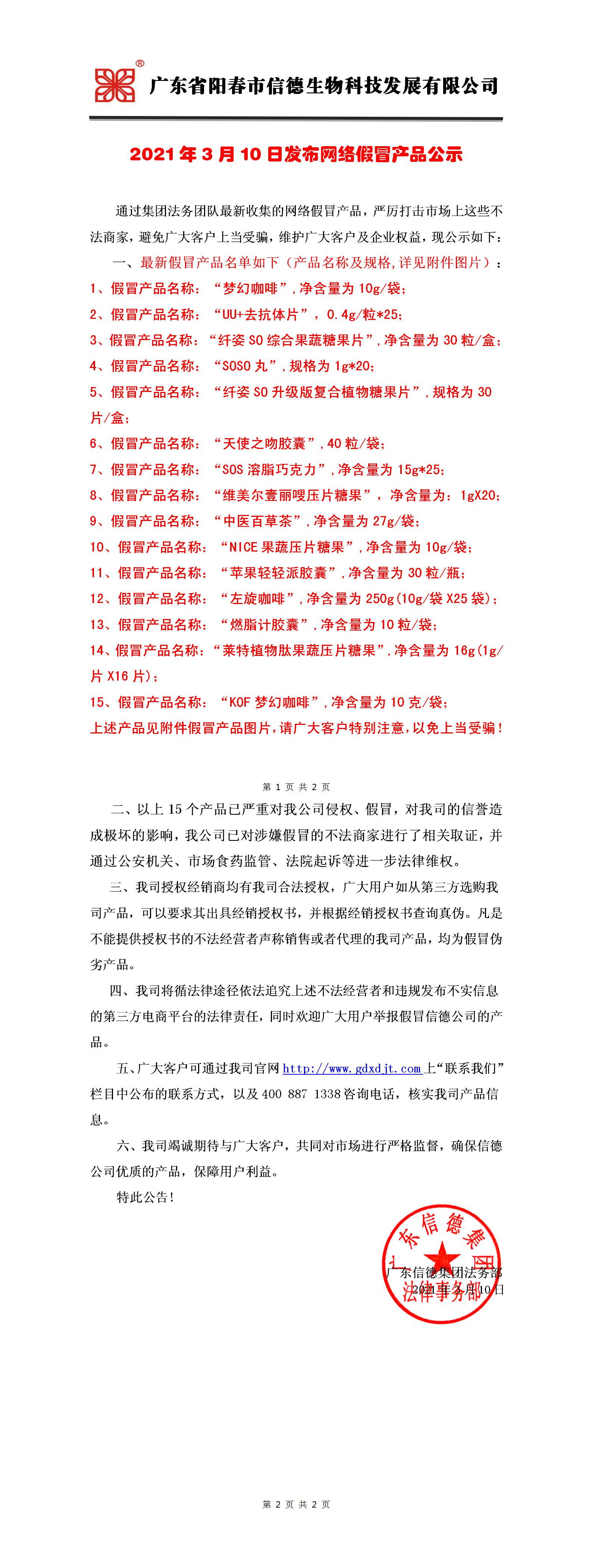 2021年3月10日廣東信德集團發布網絡假冒產品公示!!!