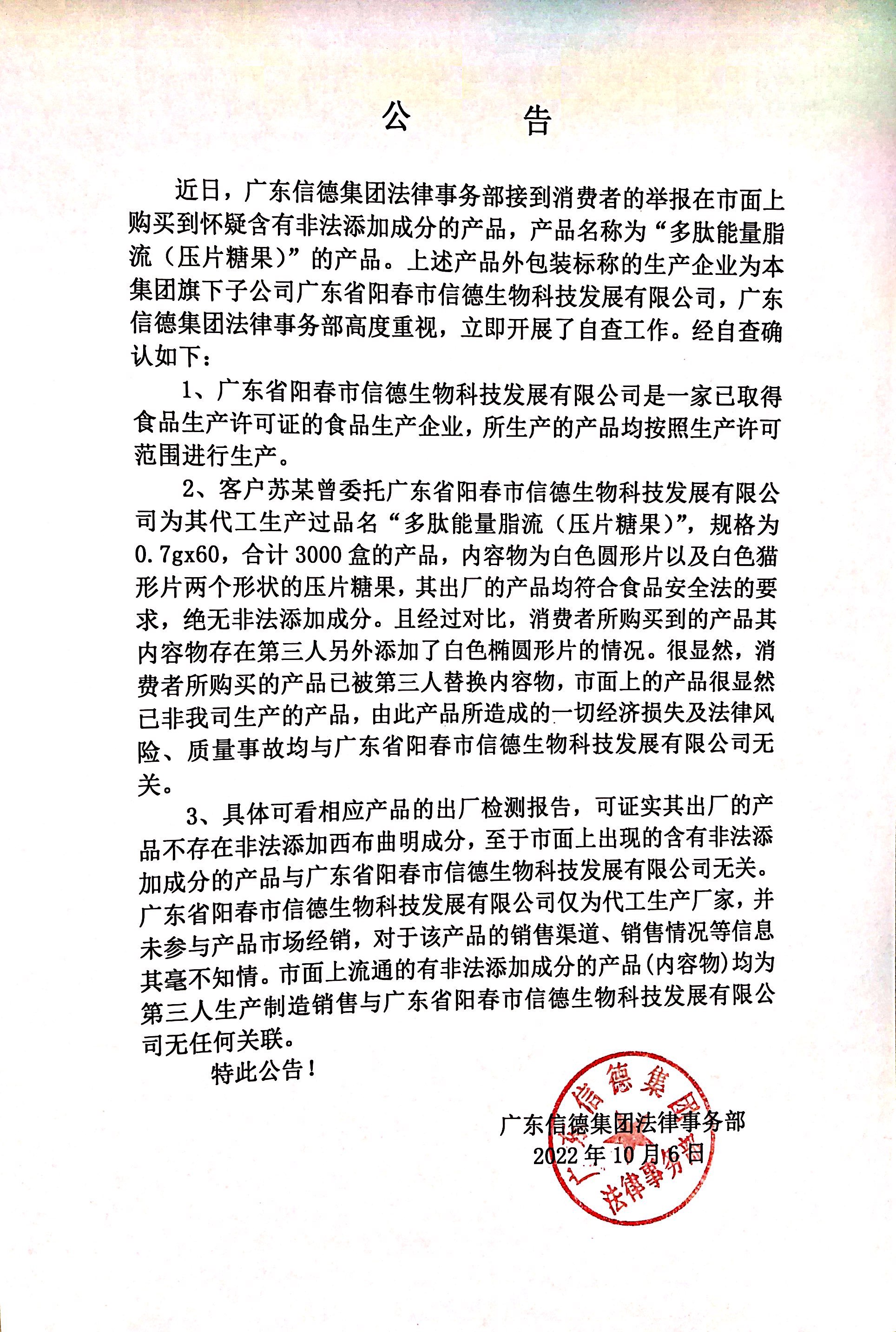 關於盜用我司生產資質製售假冒產品的公告-“多肽能量脂流(壓片糖果)”